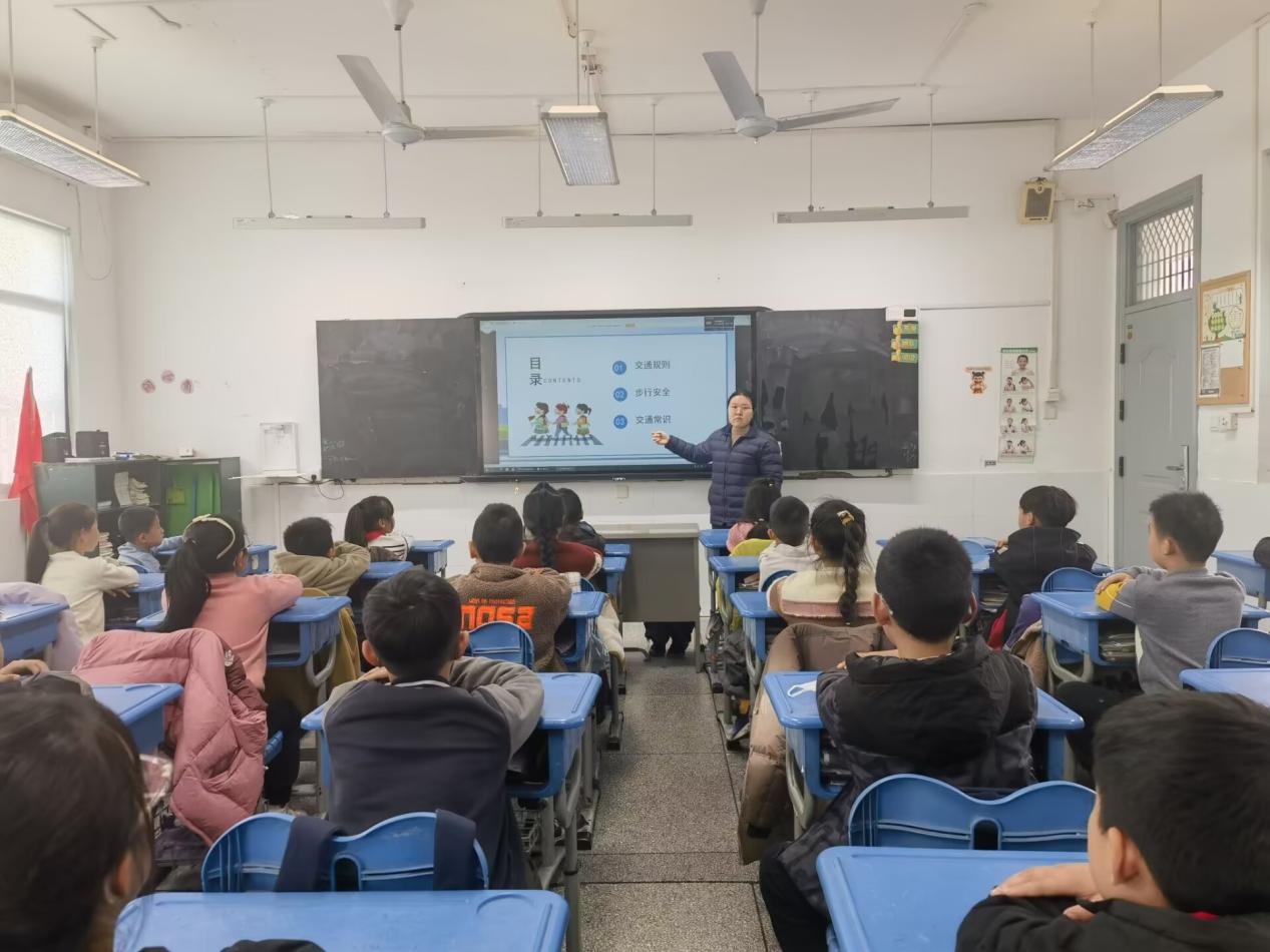 针对上下学乘车、骑行等场景,蒋老师逐一明确注意事项:乘坐私家车需全程系好安全带,不将头手伸出窗外;乘坐公交车要排队候车、有序上下,不抢占座位、不喧哗打闹;未满规定年龄不骑行自行车、电动车上路,骑行时务必佩戴安全头盔。同时,她通过互动提问引导学生主动思考,强化对交通规则的记忆。
