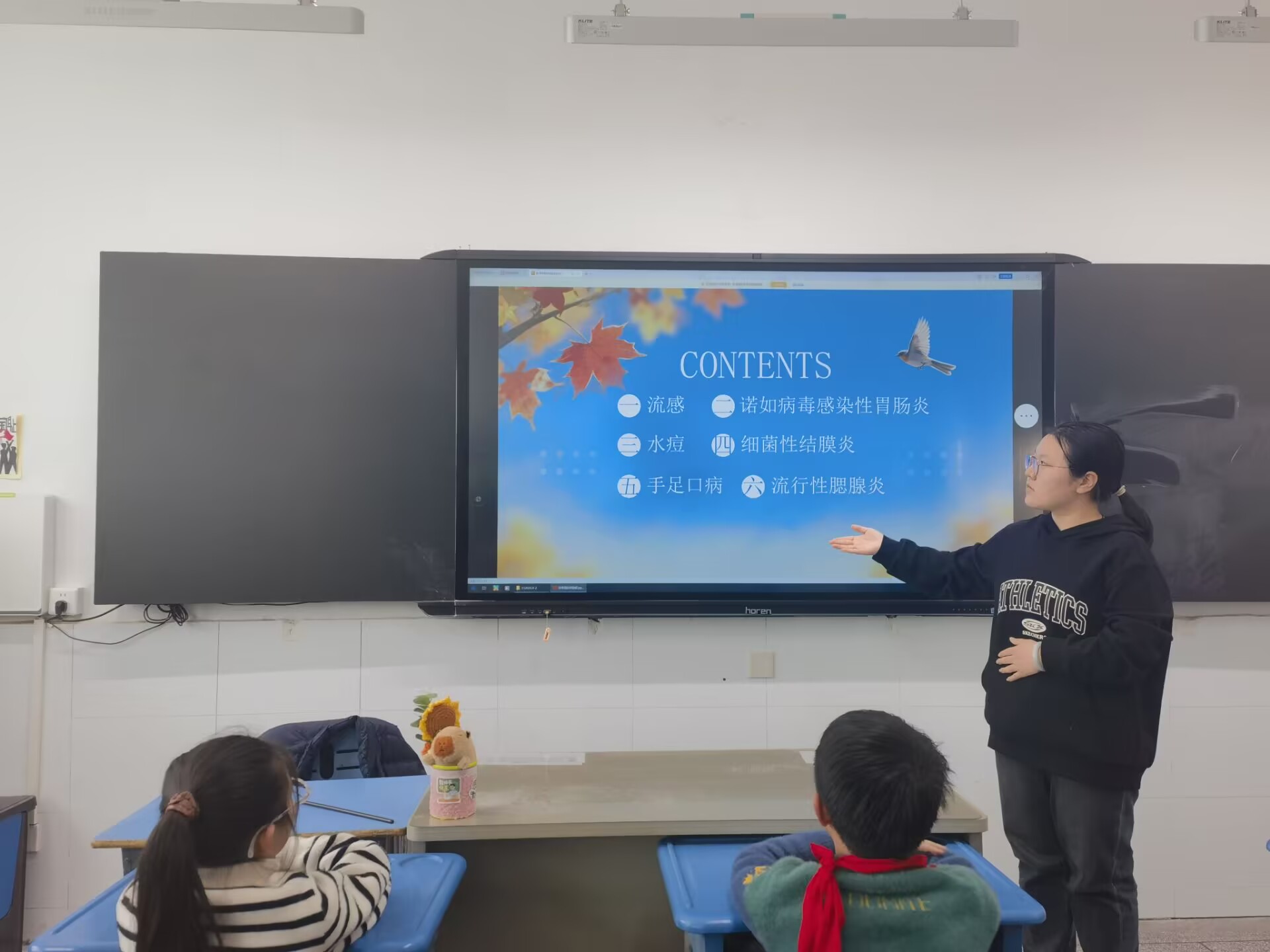 讲座中,蒋庄蕾老师结合小学阶段常见传染病特点,用通俗直白的语言与生动案例,系统讲解了流感、手足口病、诺如病毒感染性腹泻等高发传染病的传播途径、典型症状及危害。她着重强调,校园人员密集,传染病易通过呼吸道、接触等方式传播,早发现、早报告、早处置是防控关键。