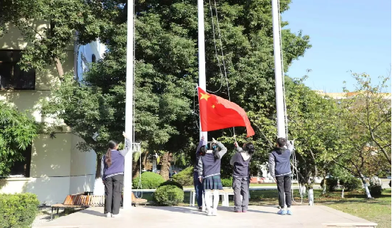 入场式完毕后,全场肃立,升国旗和体育节节旗。国旗和节旗冉冉升起,同学们庄严肃穆。
