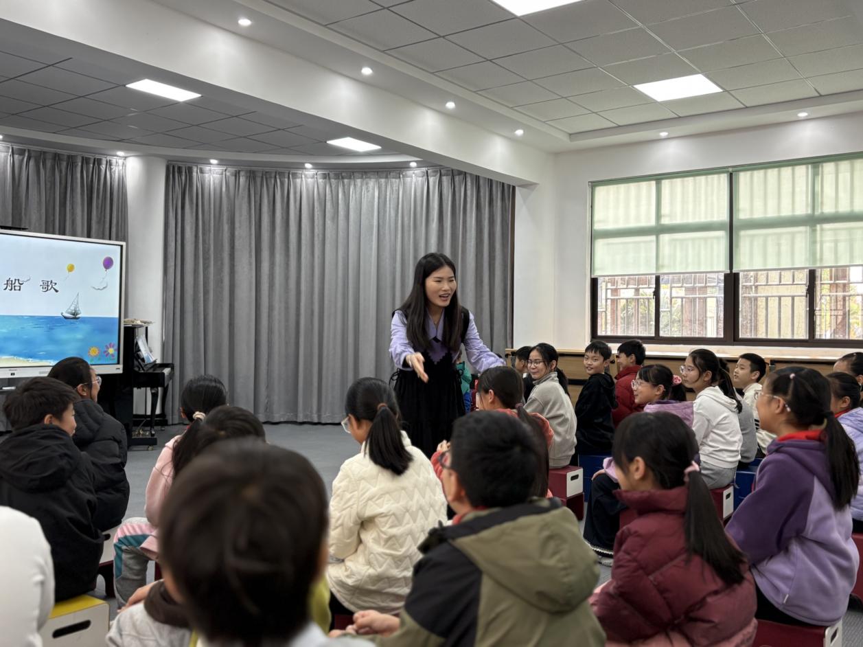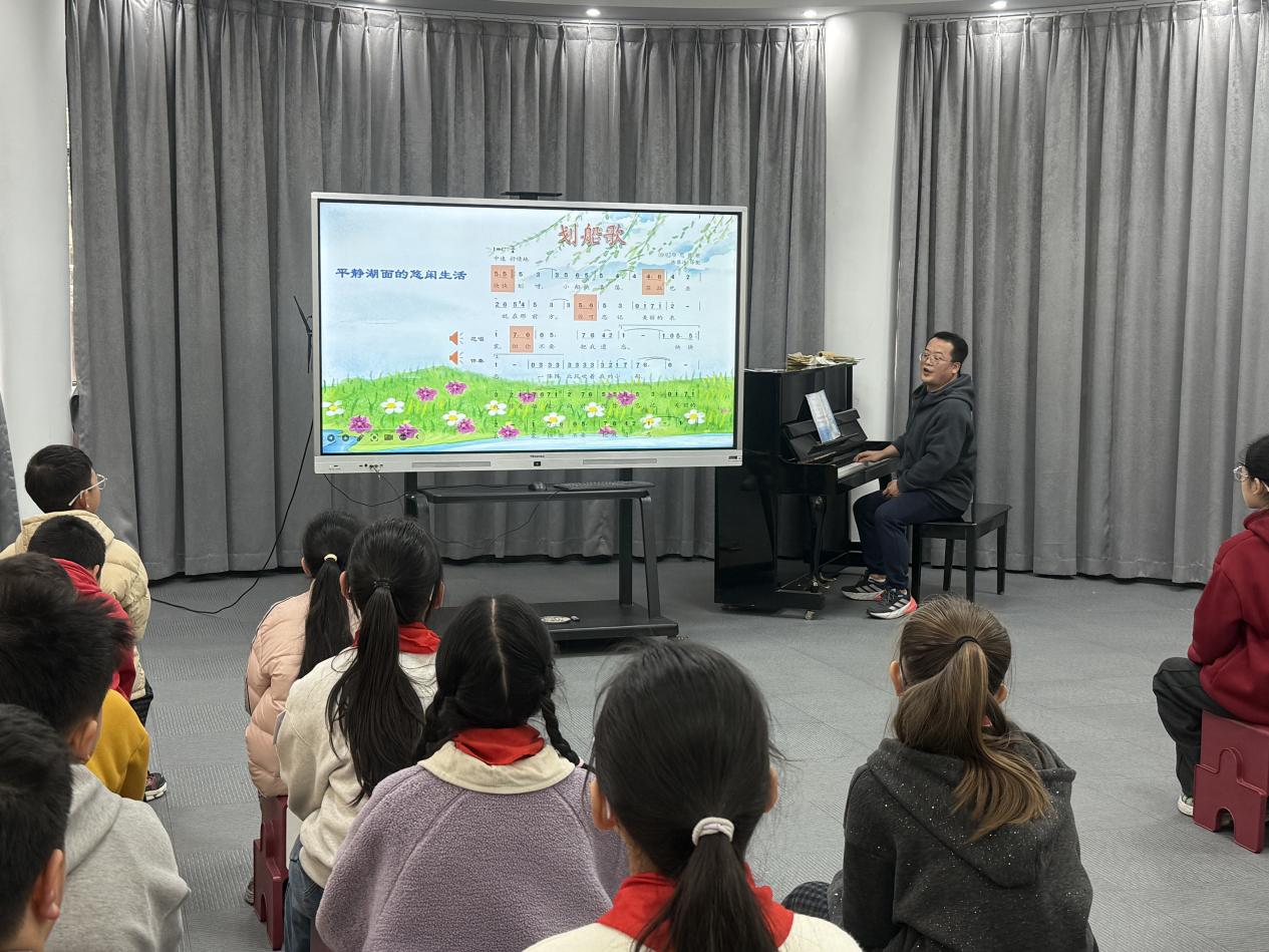 本次选拔分为试讲与上课两个环节,其中试讲环节时长8分钟,不安排真实学生,要求教师完整呈现核心教学环节与互动流程;上课环节则抽签对应教学班级,按常规课堂流程开展教学。活动中,6位教师均围绕新课标理念与核心素养培育目标精心备课,试讲阶段以三年级《牧童之歌》为课题,范亦飞、周蓉洁、李英三位教师依次进行展示,凭借精巧的教学设计、生动的教学表达,展现了扎实的教学基本功;上课环节以五年级《划船歌》为授课内容,万方雨、尤校杰、赵佳三位教师,为学生带来了兼具趣味性与专业性的音乐课堂,充分调动了学生的参与热情。赛前,所有参赛教师均按要求提前完成课件与教具调试,保障了选拔活动的顺利推进。